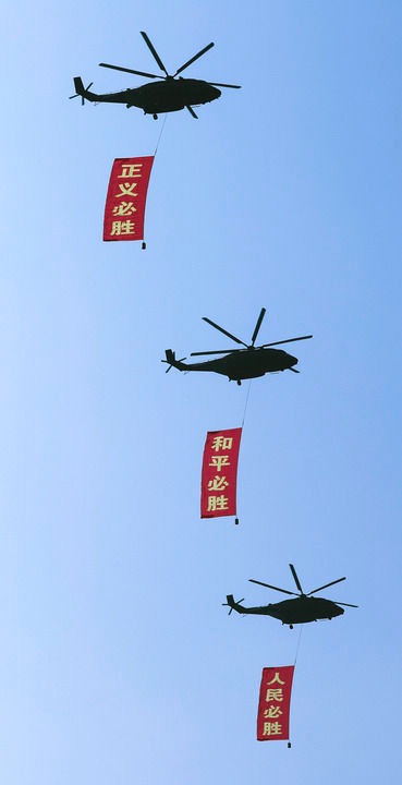 2025年9月3日,纪念中国人民抗日战争暨世界反法西斯战争胜利80周年大会在北京隆重举行。这是空中护旗梯队通过广场,3架直-8L运输直升机分别悬挂“正义必胜”“和平必胜”“人民必胜”条幅。新华社记者 李钢 摄